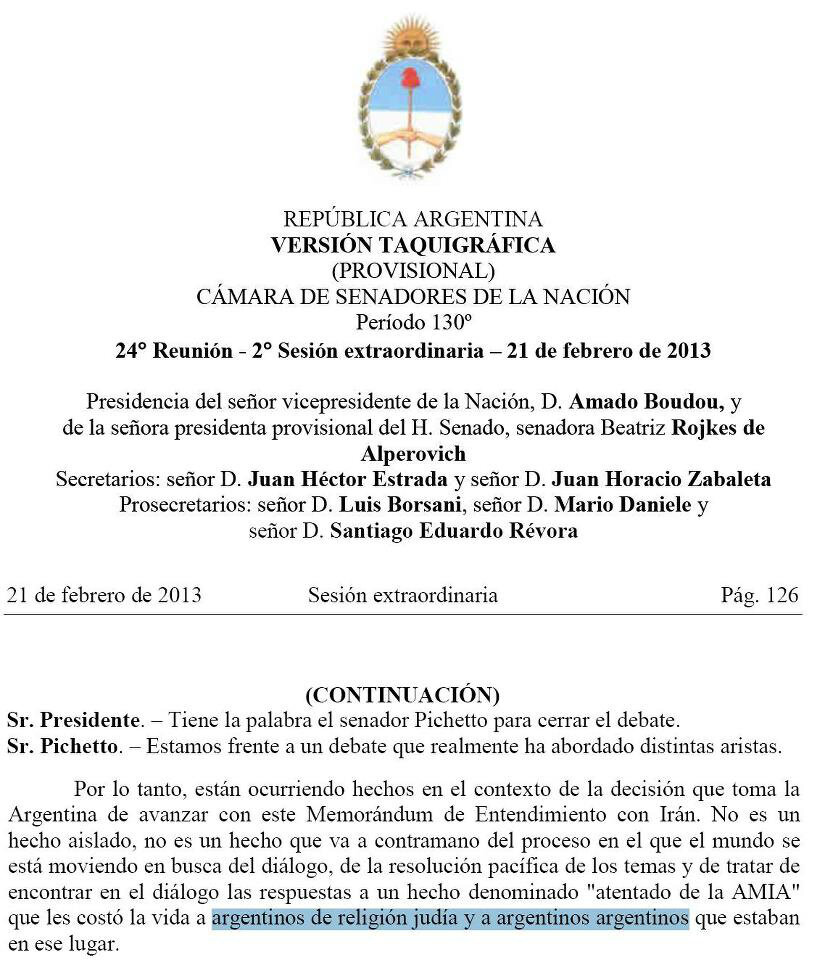 Una tercera interpretación, y no van a faltar los que la defiendan, es que Pichetto cometió un acto de discriminación sin más, curiosamente en público, en la Cámara misma del Honorable Senado de la Nación, mientras debatía la firma de un tratado con Irán. De hecho, no sabemos si existe registro de algo semejante en los anales de nuestro Congreso. Lindo tema para investigar. Por si hiciera falta, cabe recordar que Pichetto ya había hecho referencia a dos judíos (Jesús y Judas) en la famosa sesión por la resolución 125 mientras observaba fijamente al vicepresidente Cleto, pero no había aclarado si entendía que Jesús, por ejemplo, era judío judío (lo cual, por supuesto, se debió a obvias razones teológicas ya que la controversia, digan lo que digan, continúa).